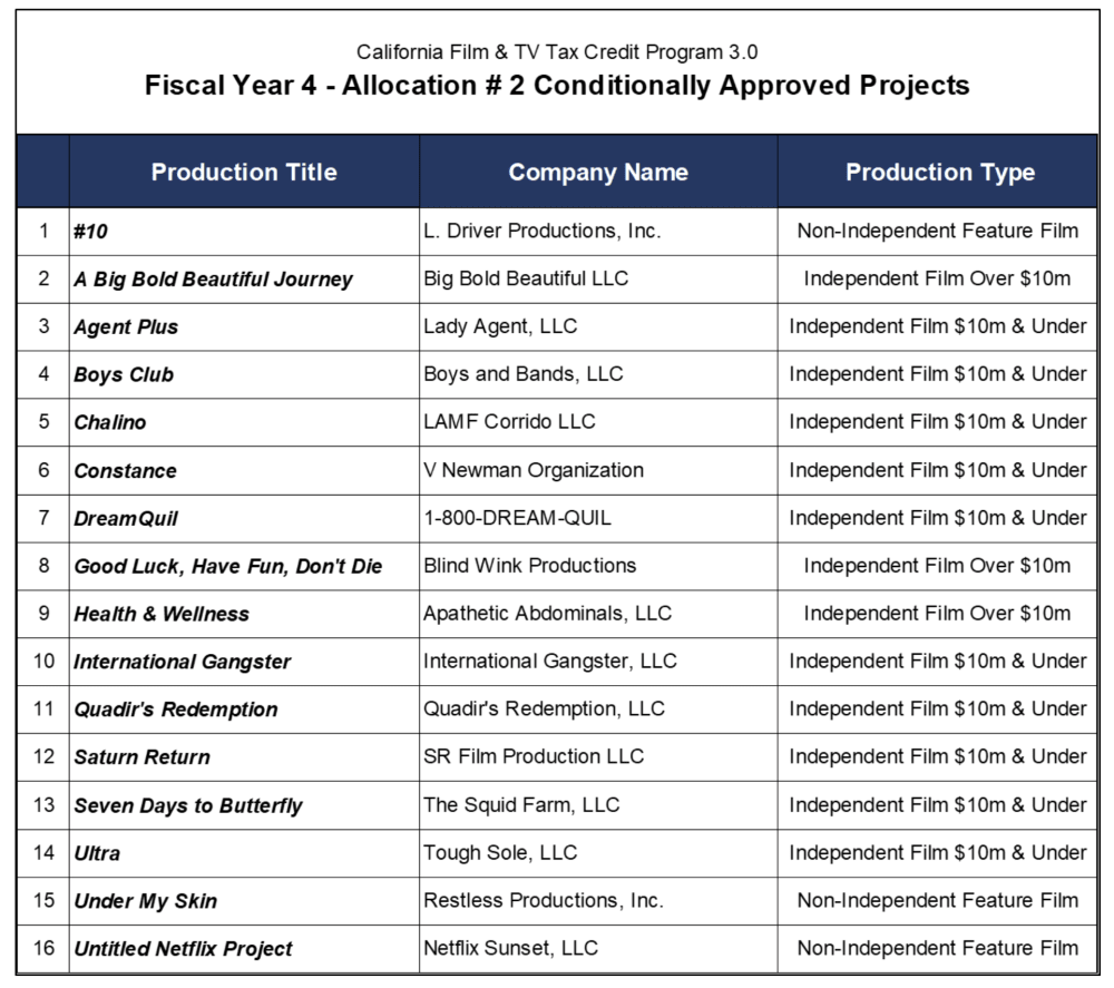According to the Commission, "the projects are on track to bring $670m (£535.5m)in total production spending to California, including an estimated $466m (£372.45m) in “qualified” expenditures (defined as wages to below-the-line workers and payments to in-state vendors). They will employ an estimated 2,422 crew, 851 cast and 23,427 actors and stand-ins. Production will be spread over a combined 626 filming days in California, including 98 filming days outside the Los Angeles 30-Mile Studio Zone."