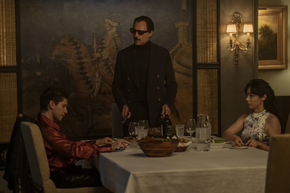 Michael Zegen, Mark Strong, and Cristin Milioti in 'The Penguin'; Source: Macall Polay/HBO